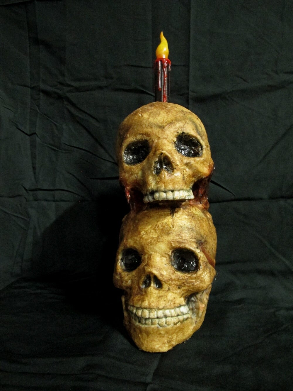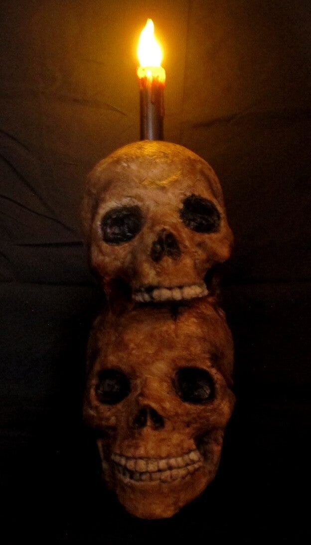 Totenkopf Deko bestehend aus 2 Schädel mit blutiger Kerze.Beleuchtet. Batterien werden benötigt.Sehr cool im dunkeln.Maße : 45cm x 20 cm x 15 cm