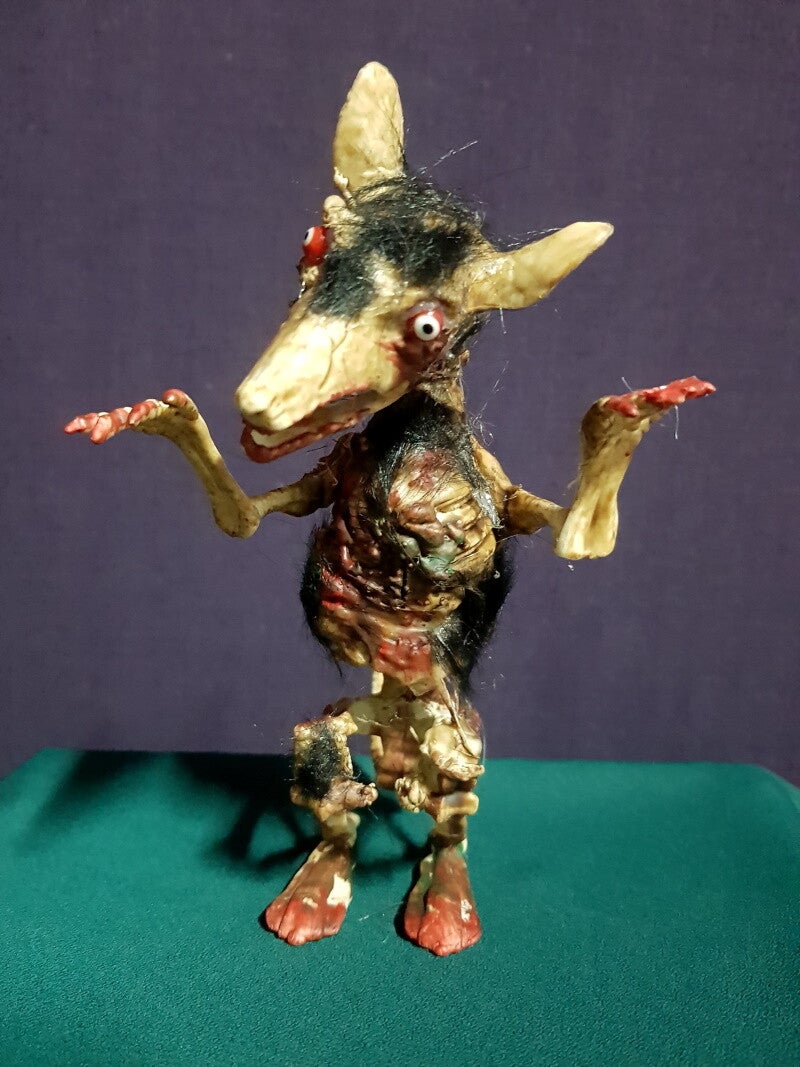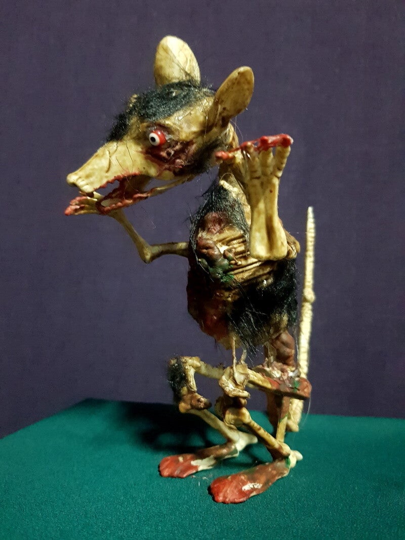 Kleine Zombie Ratte mit Fellansatz stehend.