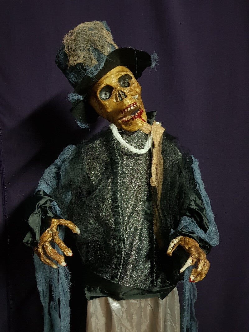 Figur bewegt Ärme und Kopf, Augen leuchten rot und macht gruselige Geräusche.